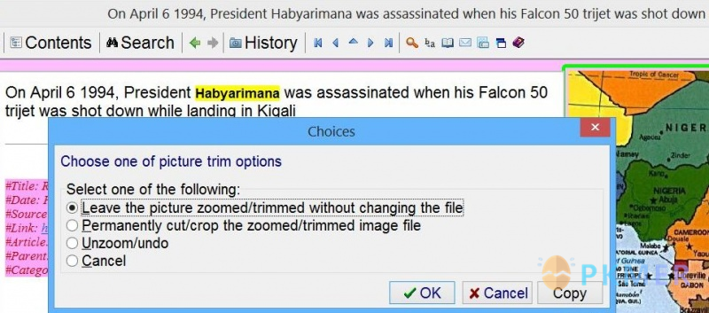 图:非洲政治地图的图片放大了卢旺达,以说明 1994 年哈比亚利马纳(Habyarimana)总统遇刺 事件。在图片中,您可以看到关于 卢旺达历史 的文章中总统的名字 没有显示。然而,在这个 元素 中,非洲政治地图被放大到卢旺达(和邻国)。放大原始图片而不裁剪原始图片文件。缩放的图片用边框标记,边框在 缩放和修剪模式 下为亮灰色,在 显示模式 下为红色。如果不裁剪图片,它将在所有使用它的 元素(包括 卢旺达历史 文章的其他 提取)中保持不变(无论是缩放还是未缩放)。