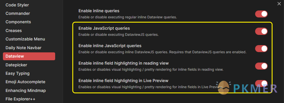 首先,打开 Dataview 插件的设置,确保这几个选项都是打开的: