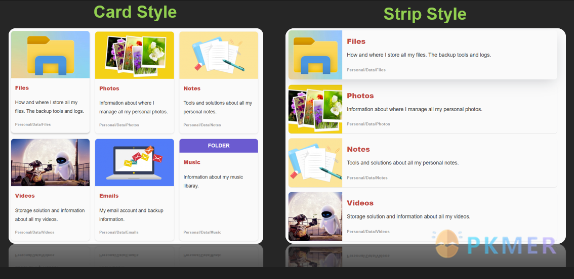 如果您想要配置 ccard 代码块的内容和外观,请参阅 ccard语法。您可以配置样式、列数、图像前缀、文件夹路径、仅笔记、最大简要长度等。例如,下面的图片展示了不同样式的文件夹概述。