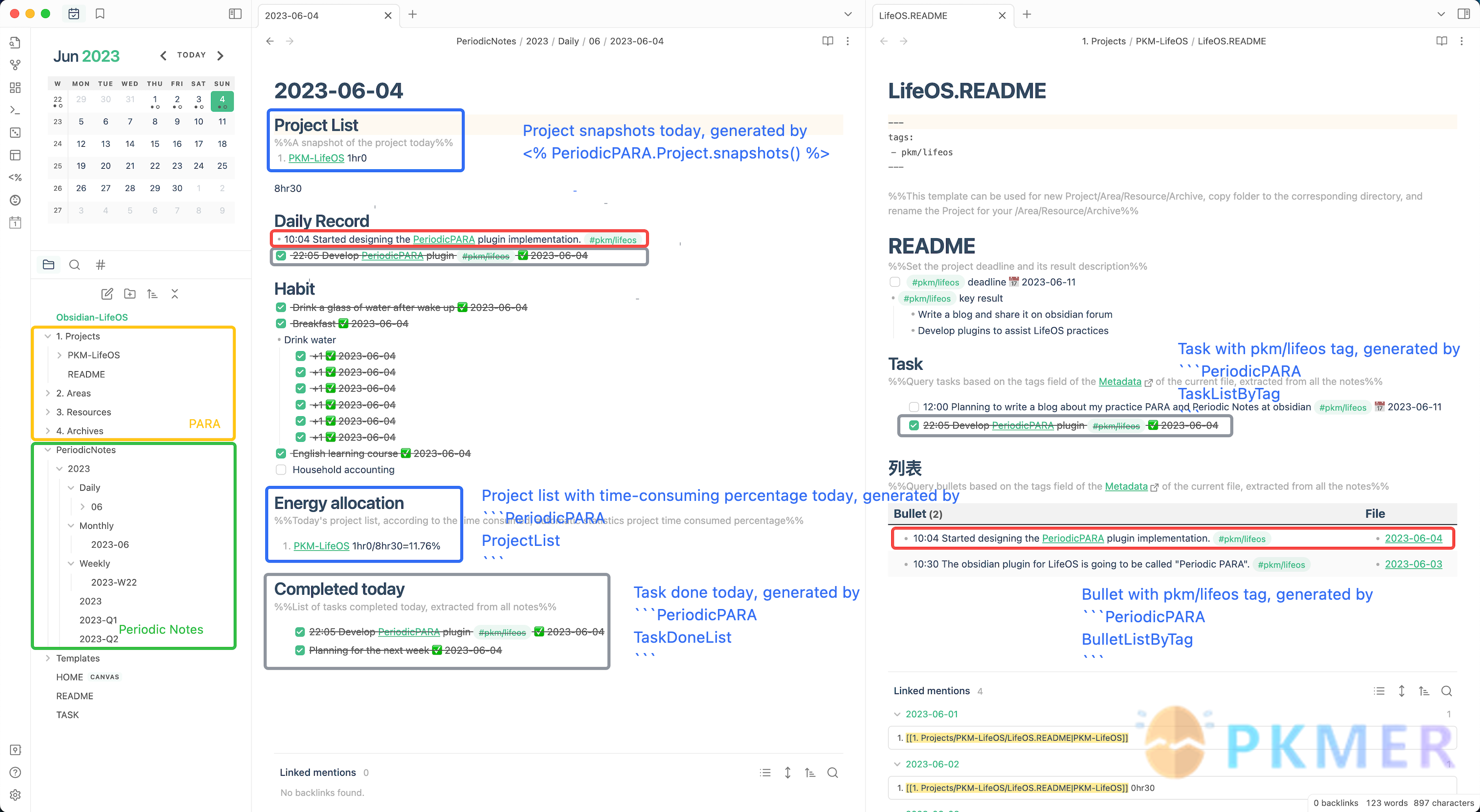 Obsidian Periodic PARA 是一个插件,用于帮助用户使用周期性笔记来实践 PARA 系统。通过这个插件,用户可以创建周期性笔记和 PARA 笔记,并根据时间和标签查询项目、区域、任务、资源和存档列表。插件提供了一个查询代码块和 templater 助手,使用户可以根据需要生成快照列表。这个插件可以帮助用户更好地组织和管理笔记,提高工作和学习效率。