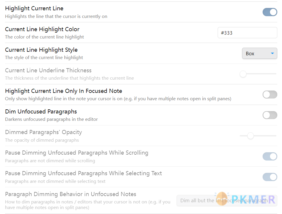 - Highlight Current Line Only In Focused Note:打开后只在当前笔记中显示高光;