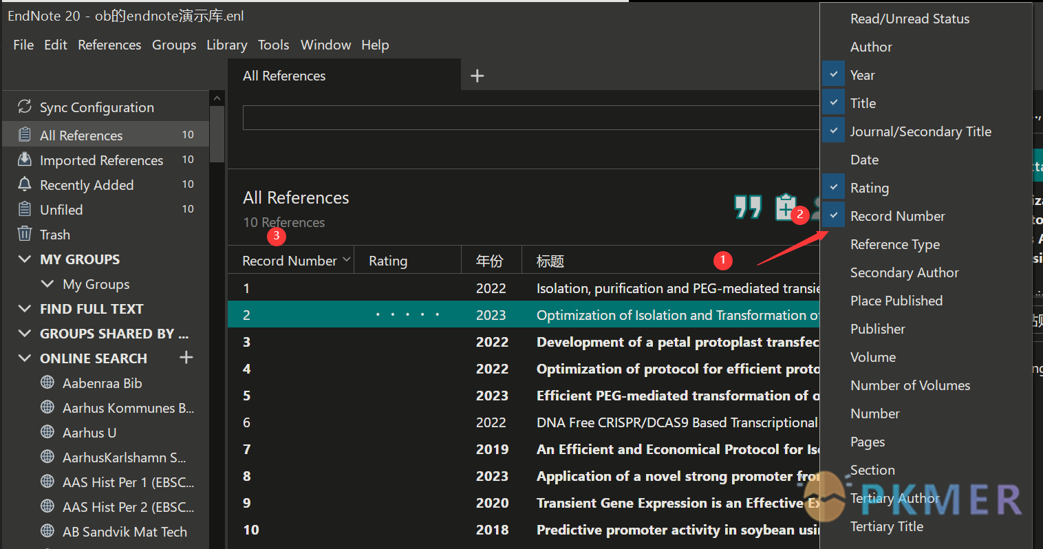 1)显示文献列表的 record number 列